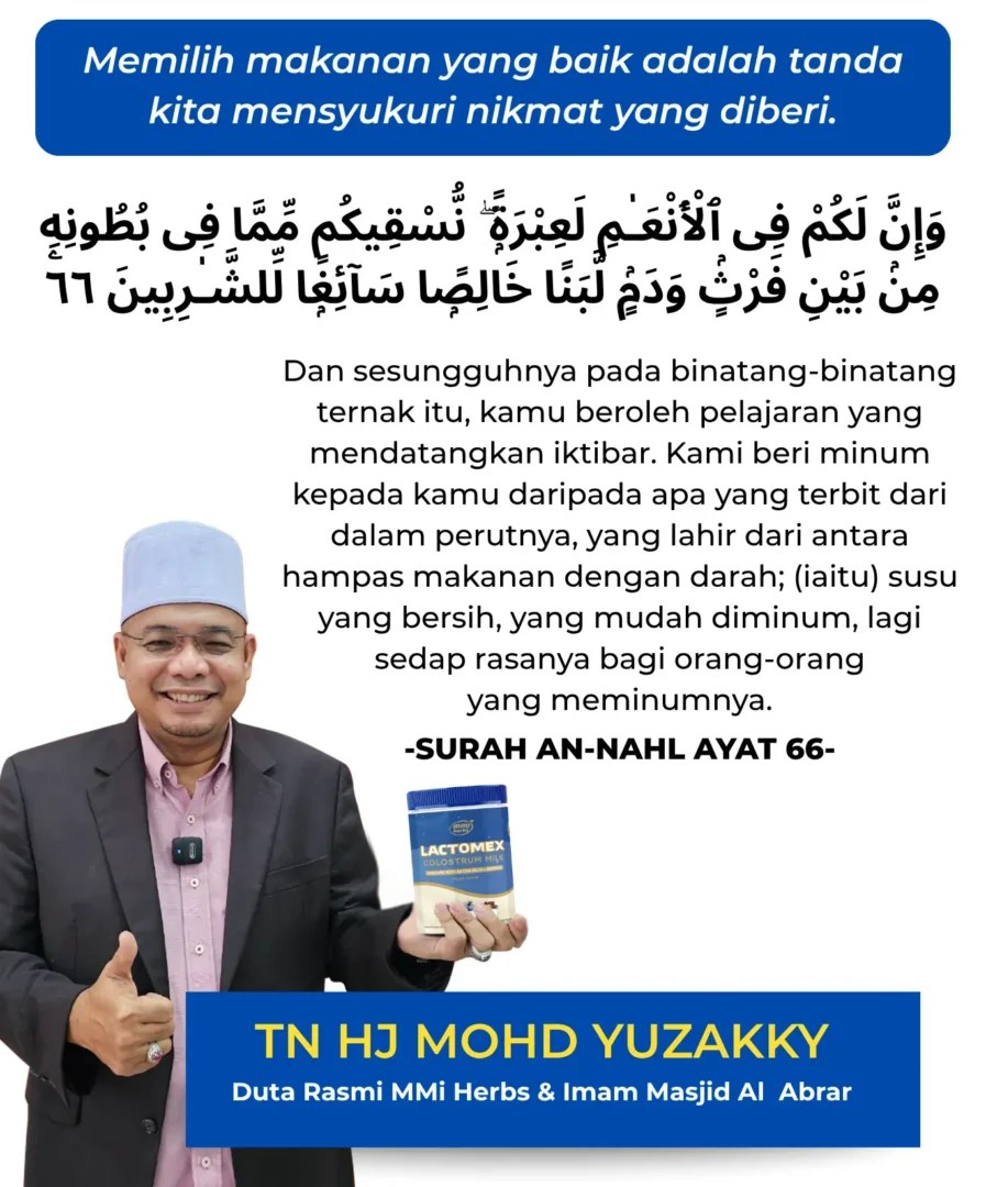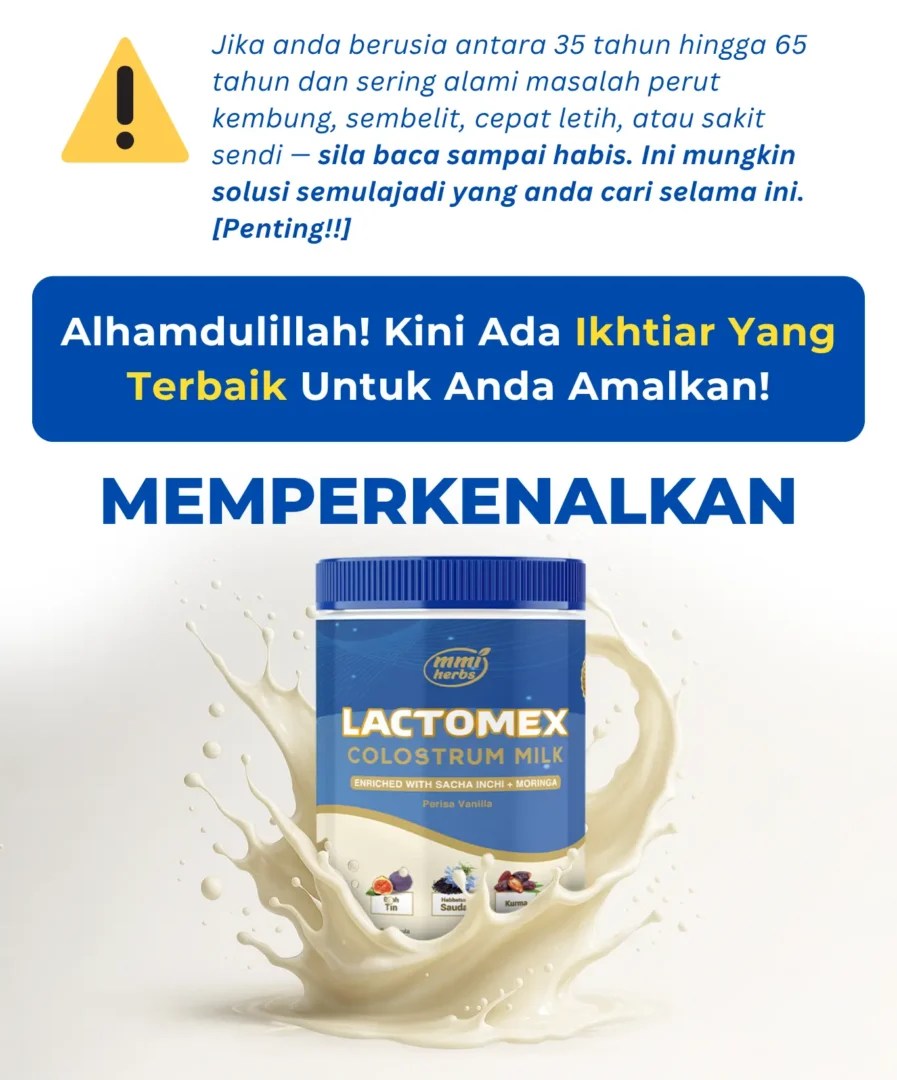 Lactomex ialah susu kolostrum premium keluaran MMI Herbs yang diformulasikan khas untuk menyokong tenaga, imuniti ,kesihatan usus dan penghadaman. Ia menggabungkan kolostrum asli, protein whey, monk fruit, gam arab dan saffron.